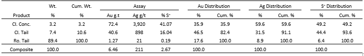 Regrinding the rougher concentrate for as much as 90 minutes resulted in production of a cleaner concentrate that was 3.2% of the ore weight, assayed 72.4 g/t Au, 3,920 g/t Ag and 41.07% sulphide sulphur and represented recoveries of 35.9% gold, 59.6% silver and 49.2% sulphide sulphur. The corresponding cleaner tail was another 7.4% of the feed weight, assayed 40.6 g/t Au, 898 g/t Ag and 16.04% sulphide sulphur and represented additional recoveries of 46.5% gold, 31.5% silver and 44.4% sulphide sulphur, Table 2.