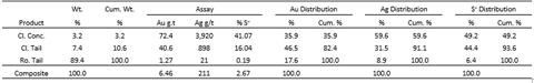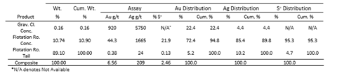 - The combined gravity and flotation concentrate were 10.9% of the feed weight and averaged 57.1 g/t Au, 1,725 g/t Ag.