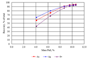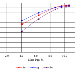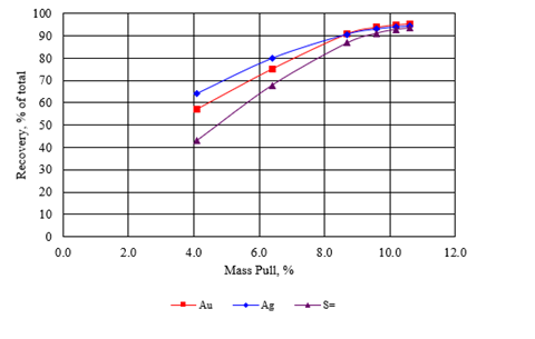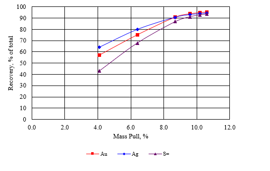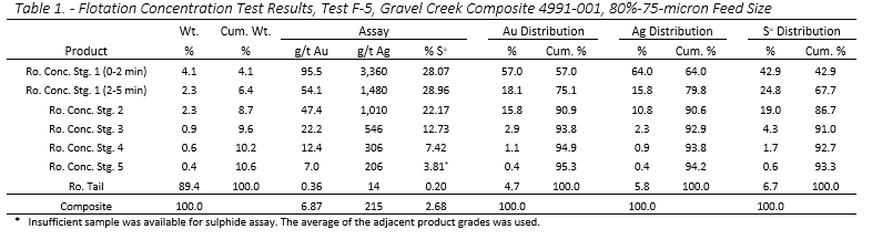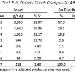 Flotation testing showed that the Gravel Creek mineralization responded very well to bulk sulphide flotation treatment. Gold and silver recoveries of as high as >92% were achieved with rougher flotation mass pulls of approximately 11%, Table 1 and Figure 1