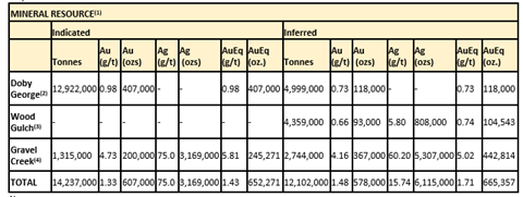 The 6,000-hectare Aura Project has established mineral resource estimates in three different deposits (Doby George, Gravel Creek and Wood Gulch), as reported in the "2021 Updated Resource Estimates and Technical Report for the Aura Gold-Silver Project, Elko County, Nevada" dated October 20, 2021 (with an effective date of October 14, 2021) that was prepared for the Company by Mine Development Associates (the "Technical Report"; see Table 3 below). The mineral resource estimates in the Technical Report were established in accordance with National Instrument 43-101 – Standards of Disclosure for Mineral Projects ("NI 43-101").