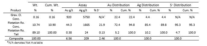 Follow up locked-cycle flotation test work was conducted at an 80% - 150-micron grind size on gravity tails generated from the sample composite. Test results showed that the combined gravity and flotation concentrate was 10.9% of the feed weight, assayed 57.1 g/t Au and 1,725 g/t Ag. Recoveries reporting to this combined concentrate were 94.8% gold and 89.8% silver of the values contained in the whole feed. The combined concentrate described above included a gravity cleaner concentrate and flotation rougher concentrate (from locked-cycle testing on the gravity tailing). The gravity concentrate was 0.16% of the feed weight, assayed 920 g/t Au and 5,750 g/t Ag and represented gold and silver recoveries of 22.4% and 4.4% respectively. The gravity concentrate was not assayed for sulphide sulphur. The flotation concentrate was 10.74% of the whole feed weight, assayed 44.3 g/Au, 1,665 g/t Au and 21.9% sulphide sulphur and represented gold and silver recoveries of 72.4% and 85.4% respectively of values contained in the whole feed weight.