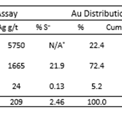 Preliminary cleaner flotation testing showed that it was possible to significantly increase concentrate grades by cleaning. Cleaner concentrate grades of as high as >70 g/t Au, >3,900 g/t Ag and 41% sulphide sulphur were achieved.