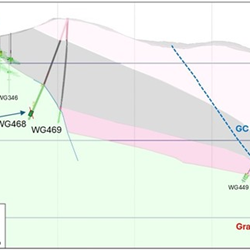 Figure 2. Tomasina Cross Section 5210N, showing Saddle Zone resource and location of holes WG468 and WG469.