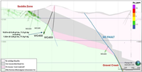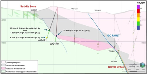 Holes WG470 and WG471 were drilled down dip of the Saddle zone on section T5120N (Figure 3) Hole WG470 was designed to evaluate the faulted contact with the Frost Creek tuff. The entire interval was clay +/- silica altered with local quartz-sulfide stringers, averaging 24.38 meters @ 0.26 g/t Au and 3.2 g/t Ag. Hole WG471 was designed to offset the vein zone intersected in WG468, as well as evaluate the extension of the Saddle resource zone approximately 300 meters down dip from known mineralization. Variable amounts of quartz +/-pyrite +/- marcasite veining were noted within bleached and locally silicified argillite of the Schoonover Formation. The strongest results included 1.52 meters @ 4.68 g/t Au and 10.0 g/t Ag (within a broader interval grading 15.24 meters @ 0.86 g/t Au and 4.1 g/t Ag) and a second interval of 4.57 meters @ 1.62 g/t Au and 15.5 g/t Ag.