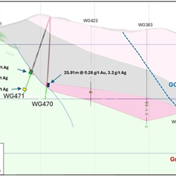 - 1.52 meters of 4.68 g/t Au and 10.0 g/t Ag within 15.24 meters @ 0.86 g/t Au and 4.1 g/t Ag in WG471