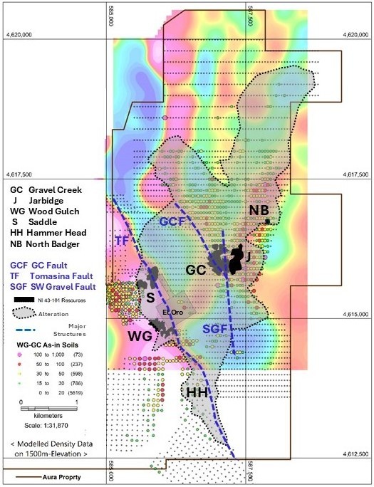 The 2025 RC drilling confirmed that significant hydrothermal alteration and local quartz-pyrite-marcasite veining extends along at least a 1.5 kilometer strike length of the Tomasina Fault Zone, 1.0 kilometer west of the Gravel Creek area. Based on mapping, geochemical sampling and drill hole observations, the area of hydrothermal alteration through the Wood Gulch-Gravel Creek area has expanded to a zone nearly 7.0 kilometer long and up to 2.4 kilometer wide (Figure 4). Although the alteration zone generally follows a north-south trend, it is strongly influenced by northwest and northeast trending structures, with the Tomasina Fault, GC Fault and strong northeast trending density anomaly under Gravel Creek as examples.